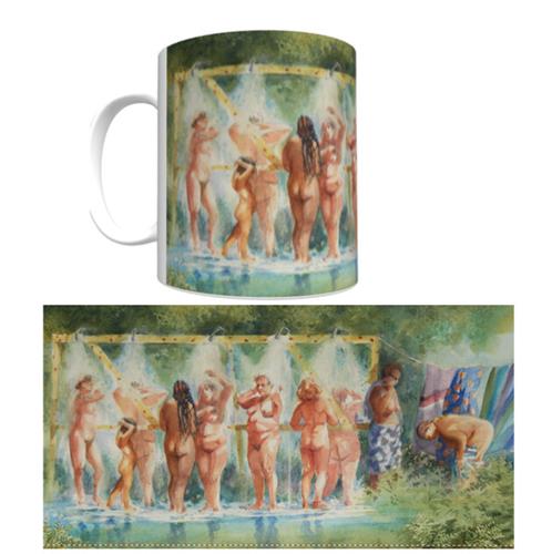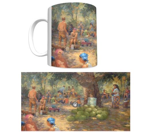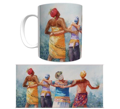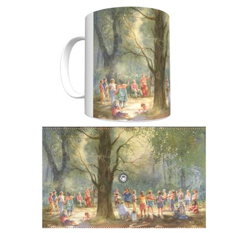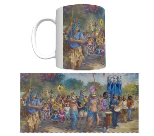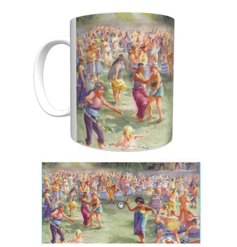 White Ceramic 12 ounce coffee mug with wrap-around festival print. Microwave and dishwasher safe. Limited stock.