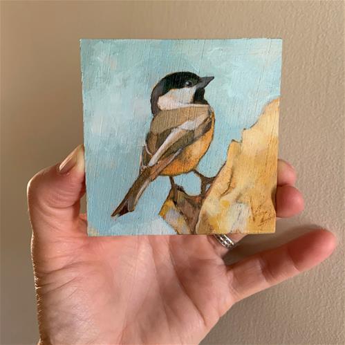 This is a small study of a Carolina Chickadee. These mini pieces are a lot of fun to work on but finding the small wood boards are not easy. So I had a neighbor cut down a larger piece for me and now I have a whole stack of 3x3 in. pieces to play around with. More to come!