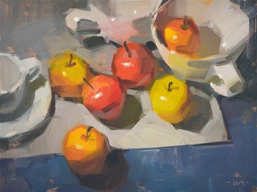 I just realized how similar this one is to the one I posted a few days ago! Oh well. I love the little jewels of color (apples) against the grays of the paper and cups.
