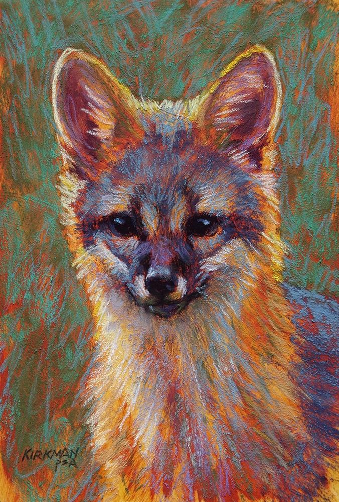 This sweet fox lives in our back yard. He usually only comes out at night, but I managed to get a few pics one evening when the sun was just setting. He was just a youngster then. My husband has seen him recently and says he's much bigger now. The photo I took was much cooler in tone, but the underpainting colors I use helped create a warmer look!