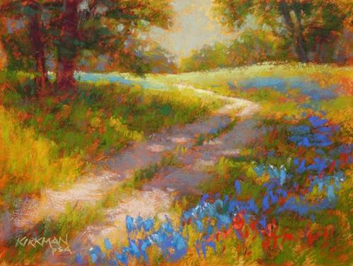 Wow, I had forgotten to post the Park Trails from the "Walk in the Park" Paint-Along in April! Oops! So here's "Park Trail #57" (pastel, 6x8 inches) the first of two I did for the paint-along. This one I underpainted in the same manner as most of my paintings; with the gold and terra cotta acrylic-based primers. You can really see the warmth shining through the cooler greens and blues. We added wildflowers (bluebonnets and Indian paintbrushes were my choice) just to celebrate springtime.