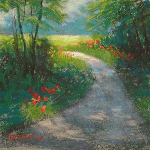 Here's the other little landscape from the "Walk in the Park" Paint-Along last month. "Park Trail #58" (pastel, 8x8 inches) In contrast to "Park Tail #57," posted yesterday, this one had no underpainting. Instead I worked it up directly on a mid-toned gray-ish Pastel Premier paper. The interesting thing is I used pretty much the same pastels for both paintings! What a difference the surface color makes!