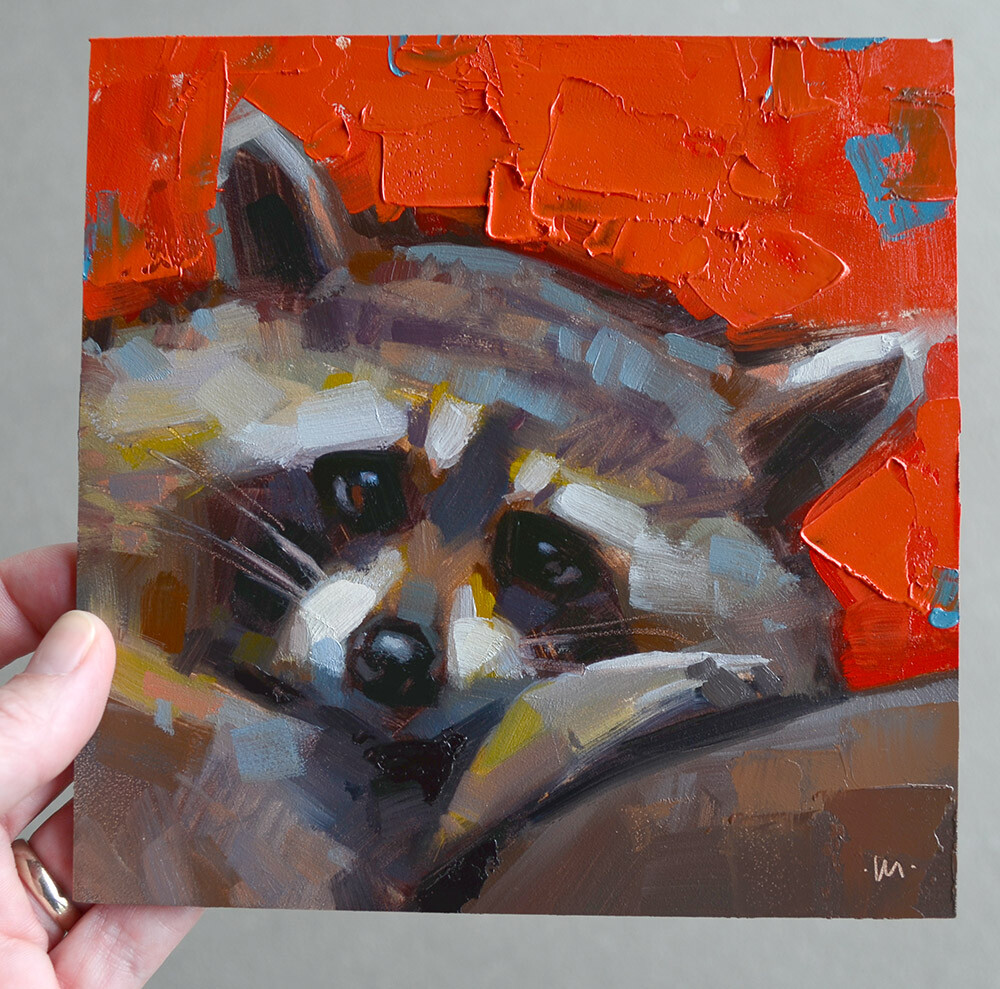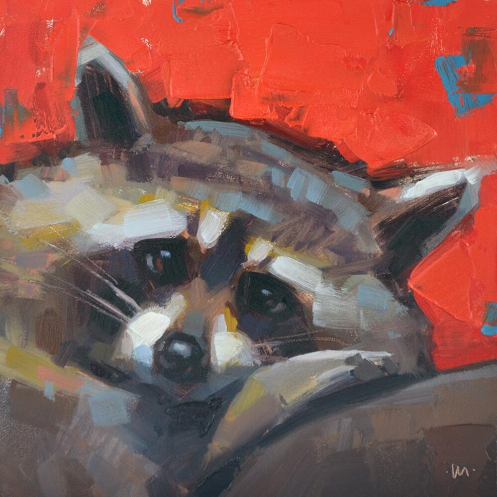 I found this adorable racoon on Pixabay. The background in the original reference was pretty boring, so I played around with alternatives on my ipad and settled on this one - I would call it a tomato red. And that's why he's sad - he didn't find any tomatoes.