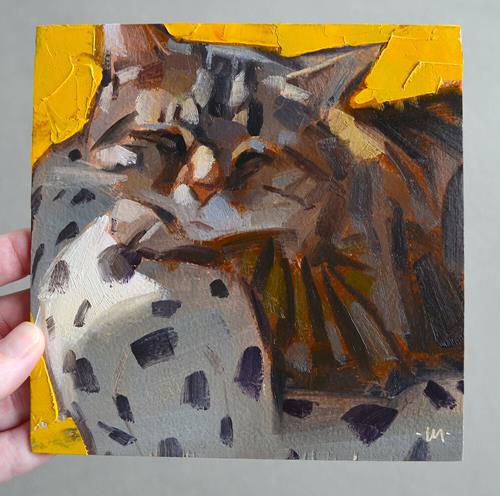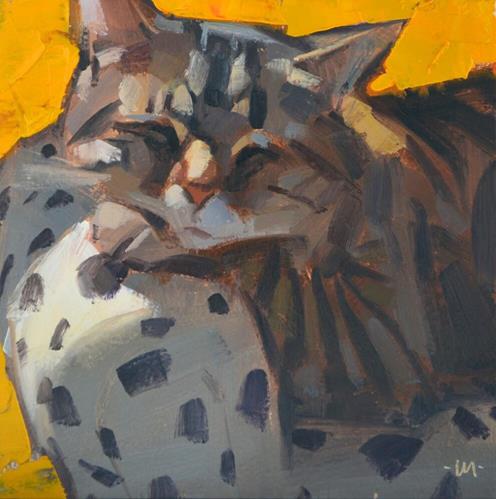 Here's another Pixabay find, on gessoed hardboard. The cat is on a tiny, polka-dotted couch! Once again I completely changed the background.