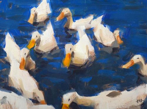 I found a reference image with a whole bunch of ducks, and cropped in on this little batch. Even then I had to omit a couple to make it work. Then I started to paint, keeping it very abstract. I put the eyes in at the very end, stepped back, and they were ducks. So cool when that happens.