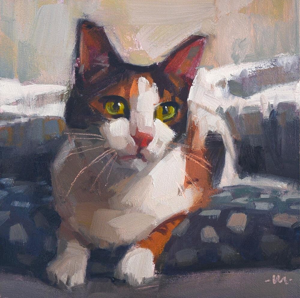 I've had a cold for a few days. The pressure in my head when I become horizontal makes it hard to sleep, so even though I feel crummy, I've mostly kept myself upright and busy, at least during the day. But I tried to paint yesterday, and what I found is that the crumminess was too distracting, and probably the exhaustion from not sleeping well, and nothing I painted turned out. Luckily I'm still ahead with my paintings, so here's a cute kitty from better days.