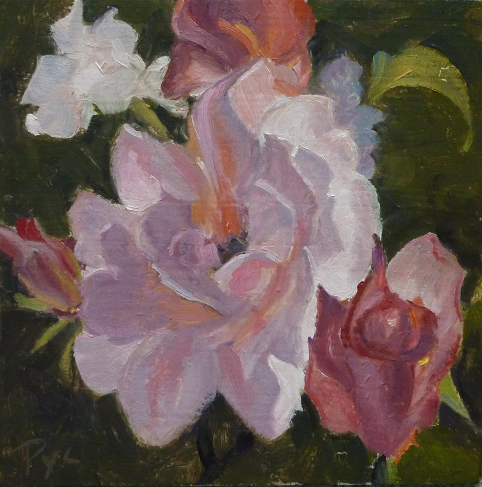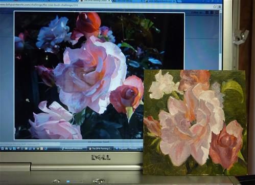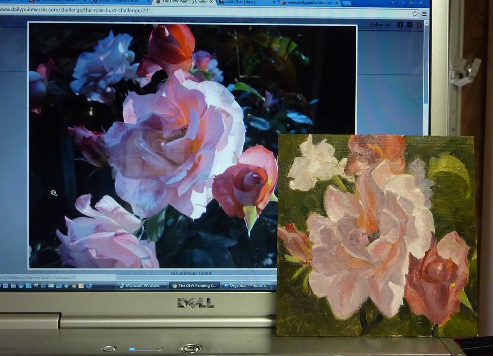 When I saw this photo of these roses in the DPW Rose Bush challenge, I wanted to paint it right away. The photo is beautiful and inspired me. It was definitely a challenge to paint it and make the colors and delicate petals look right. I did take some artistic liberties with it and I'm learning more every time I paint a flower.