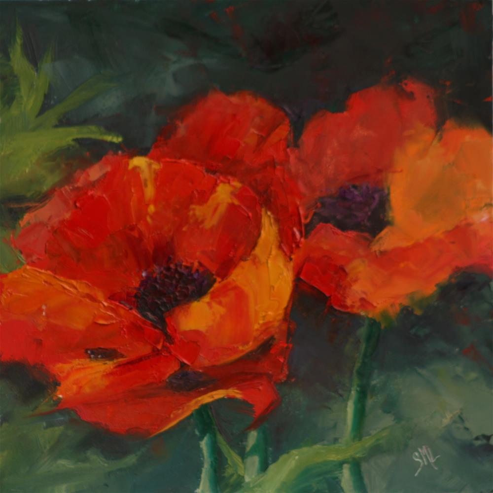 Red Poppies, a flower I chose to represent myself in Girl Scouts so long ago. Remains to be one of my favorite flowers. With this green background those reds and oranges just pop off the painting. Painted from a photo on PMP, Suzanne Johnson.