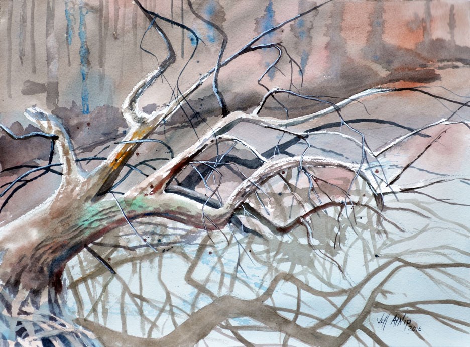 I went out this morning and sat on a log near a local pond and painted this scene. I was ​interested in the network of twigs and the reflections in the water.