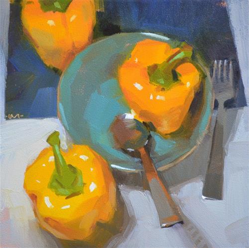 Here is one last bell pepper painting before we take off for Texas. So you know, because it helps me to know it of other people/artists, I posted the three paintings of peppers that worked, and didn't post three others that ... well, they uhhhh, didn't. My averages are usually a little better, but not a lot. And that's just the way it goes. I hope that helps.