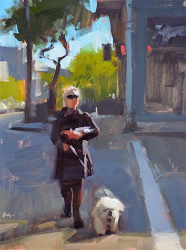 I've said this before, BUT, one of the biggest things I've realized about what a photo captures vs. what's really there is - the darks. As darks recede into space they get lighter (because of atmostphere), but photographs don't always capture that. So I try to think of these kinds of scenes as having layers. The gal and her dog are the first layer, so they are going to have the darkest darks. The next layer contains the tree and corner building, and the darks there are a little lighter than the darks in the first layer. I mix these darks right next to each other on my palette (literally touching) because it's just a subtle difference. Then the next layer, which contains the background buildings, is a bit lighter still. In the photo, all those darks are the same, so I have to really think about it rather just repeating what I see. But keeping my piles of darks all lined up in order helps, and never putting my darkest dark in any layer but the first one.