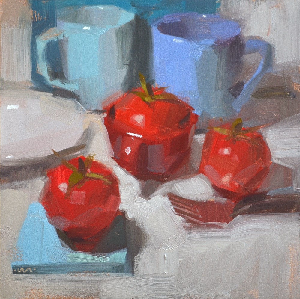 Here's my second pass at these tomatoes. For these first two I used my "daylight" florescent bulb to light the setups. I did this because tomatoes are fairly translucent, and my stronger light can obliterate the form shadow (the shadow ON the object, as opposed to the cast shadow, which is cast FROM the object) in a way I don't always like.
