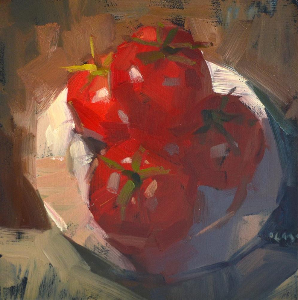 Well here it is, the last tomato painting (for now) - we made it! I did this one on a black gessoed board. I like how moody it is. Like a pile of tomatoes you'd find in a dark kitchen, on a midnight prowl for grub.