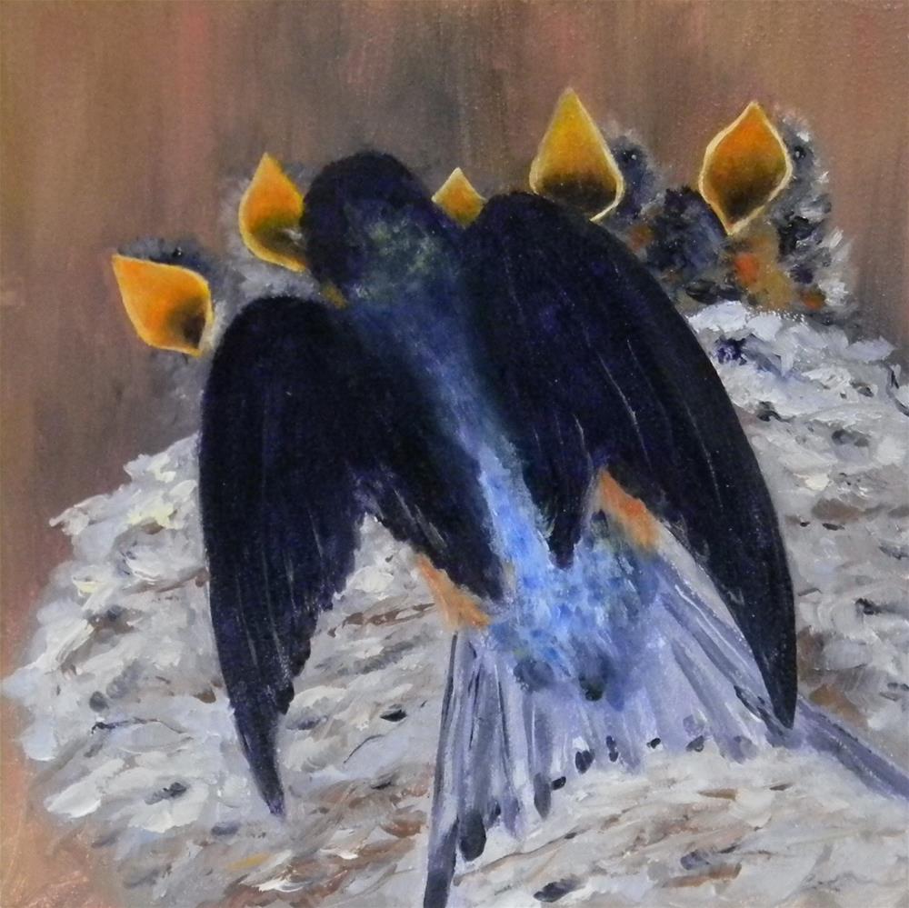 My son's girlfriend made the picture I used. We stood for quite a while watching how the parents feed the baby swallows. They are so fast. Fun to see the little beaks pop open as soon as mom or dad arrives with a new load of insects for them to eat. The painting can be framed, or hung as is (it has a small hole in the back for hanging). My son's girlfriend made the picture I used. We stood for quite a while watching how the parents feed the baby swallows. They are so fast. Fun to see the little beaks pop open as soon as mom or dad arrives with a new load of insects for them to eat. The painting can be framed, or hung as is (it has a small hole in the back for hanging). |