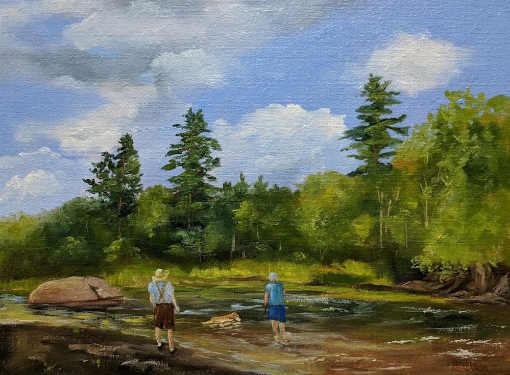 Painted plein air along the river in Saranac Lake. This nice couple was playing with their dog in the water. The dog loved making new friends and came over a few times. I just had to paint them into the picture.
