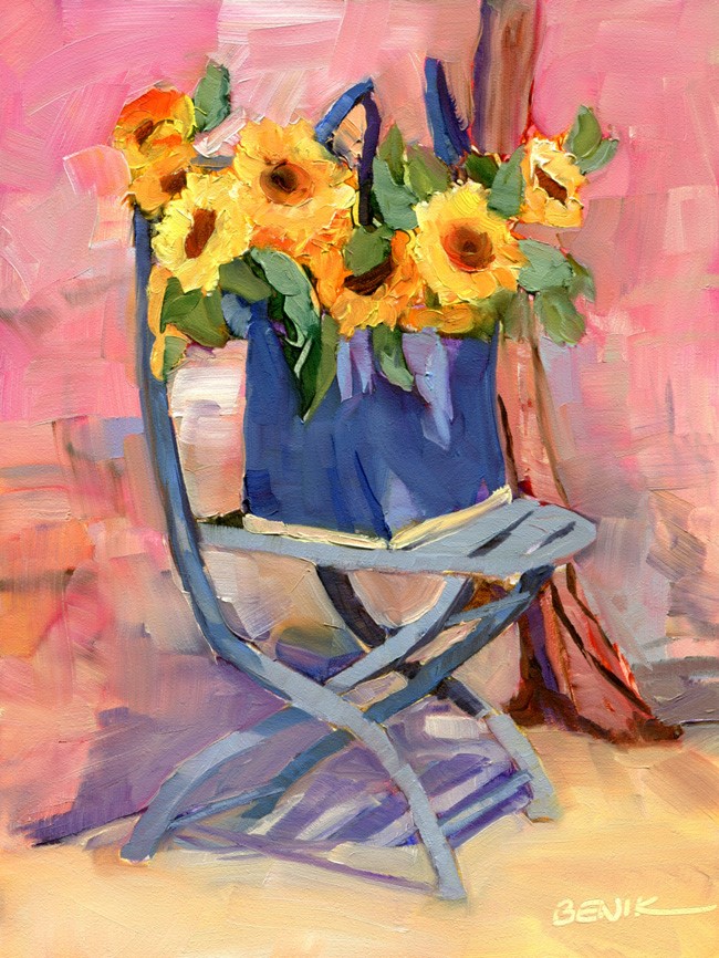 A bunch of sunflowers in a market bag sitting on a chair. (Photo credit Dreama Tolle Perry) Oil painting on gessobord, signed by the artist on front and back. Price includes the painting protected in an archival plastic sleeve and shipping to the USA via USPS priority mail. Additional shipping charges will be applied for outside the US.