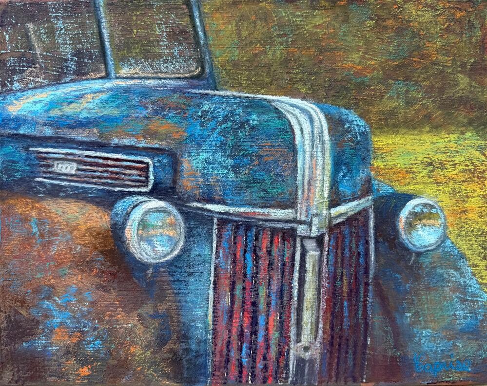 I took the reference photo at a swap meet on Petit Jean Mountain in AR. The Ford truck was red and did not have a lot of rust, so I changed up the color scheme. This is pastel on canvas with a micaceous iron oxide and metallic acrylic underpainting. This painting is not framed.