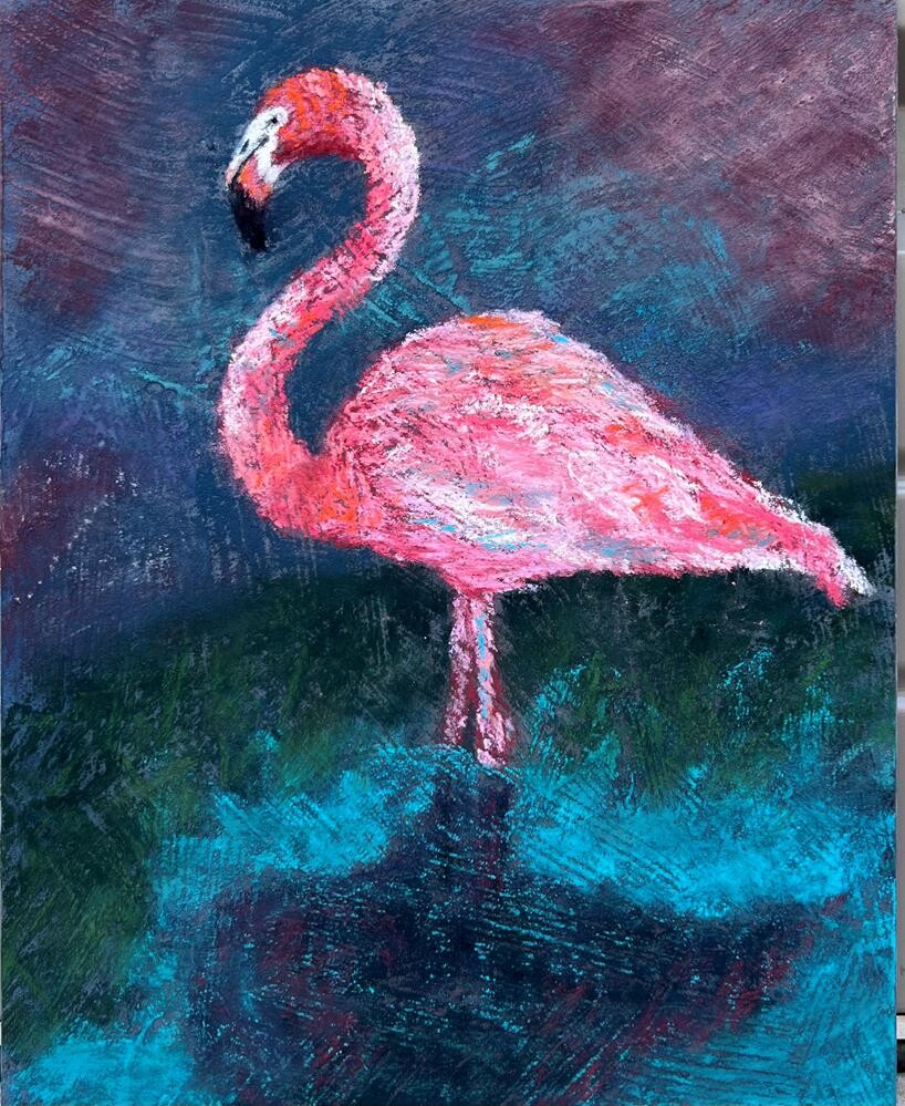 This painting is not framed. I repurposed a failed painting, covered it in gesso which created this great texture, then covered in pastel.