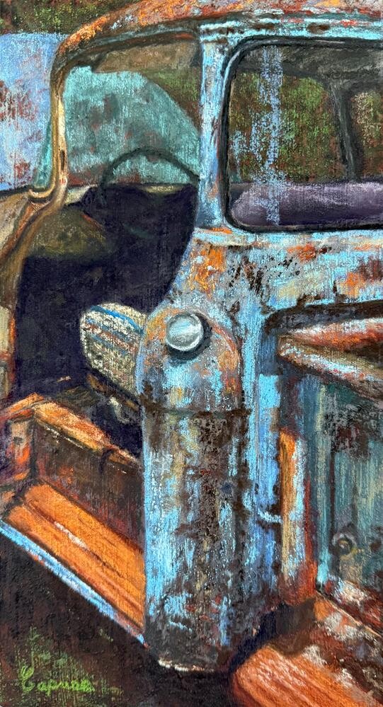 I took this photo at a swap meet on Petit Jean Mountain AR. I loved the color, peeling paint and contrast of the seat. This is painted on UArt 400 grit sanded paper, Micaceous oxide acrylic paint and metallic acrylic paint underpainting to create textures and shimmer. Then carefully applying pastel. I took this photo at a swap meet on Petit Jean Mountain AR. I loved the color, peeling paint and contrast of the seat. This is painted on UArt 400 grit sanded paper, Micaceous oxide acrylic paint and metallic acrylic paint underpainting to create textures and shimmer. Then carefully applying pastel. |