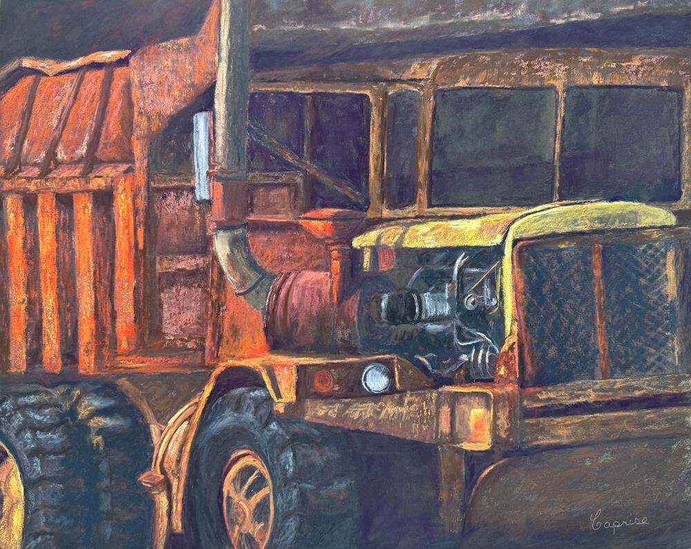 Painted on UArt 400 grit sanded in black. I use a metallic watercolor underpainting that serves as my roadmap as I apply pastel. This Cline Off-Highway Dump Truck is in a pasture off Hwy 60 between Plumerville and Toad Suck, AR. I was attracted to the great shapes, texture, light and shadow. It is also the first dump truck I’ve painted. Painted on UArt 400 grit sanded in black. I use a metallic watercolor underpainting that serves as my roadmap as I apply pastel. This Cline Off-Highway Dump Truck is in a pasture off Hwy 60 between Plumerville and Toad Suck, AR. I was attracted to the great shapes, texture, light and shadow. It is also the first dump truck I’ve painted. |