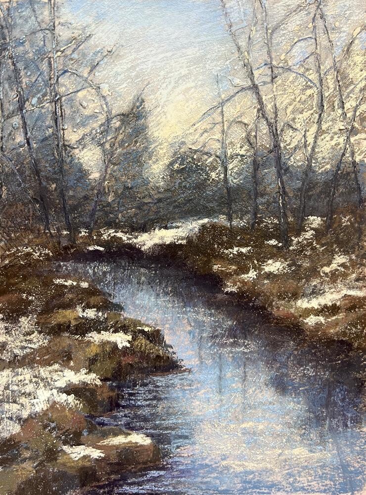 I've painted this place in the fall, so this time I wanted to take the fall photos I had and try to make a winter scene. It is created on a pastel board with a layer a acrylic paint to create the texture and tree branches, then covered in pastel. I've painted this place in the fall, so this time I wanted to take the fall photos I had and try to make a winter scene. It is created on a pastel board with a layer a acrylic paint to create the texture and tree branches, then covered in pastel. |