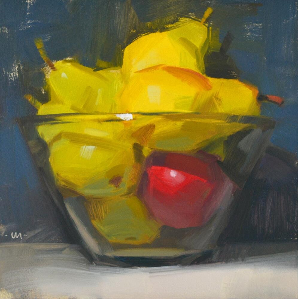 When I have a bunch of fruit, I have a hard time not painting them in a glass bowl. I've done it lots of times. Here's one of my very first ones, from 2007.