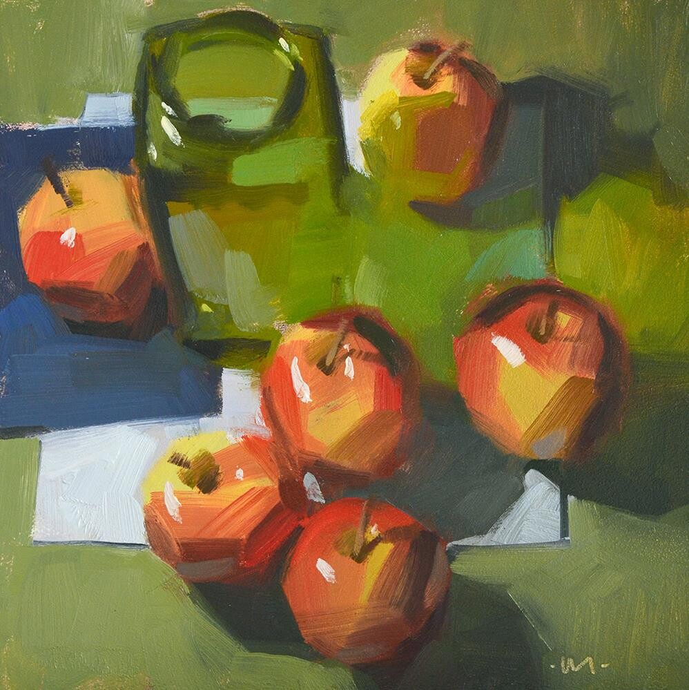 Glass and apples: two of my favorite things to paint. And green: my all-time, favorite color. Throw in a few lost edges and I'm in painting heaven.