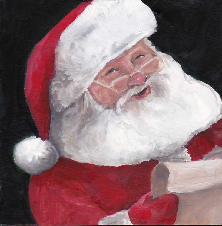 This is an oil painting of old Saint Nick checking his list