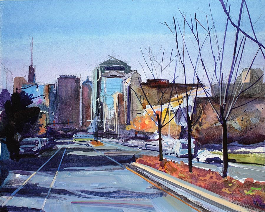 A painting of Main Street Buffalo in Autumn.