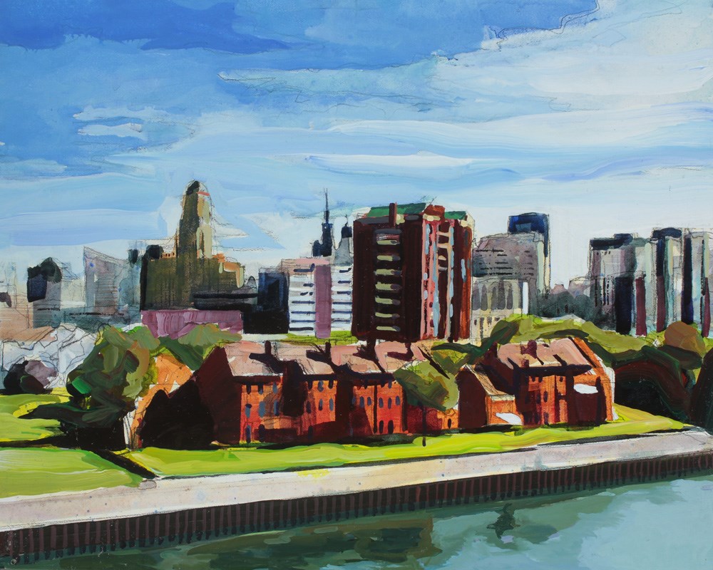 This is a view of the city of Buffalo from the observation tower at Erie Basin Marina. I took the reference photo last fall when I took a day off from work to take advantage of the warm weather. I spent the afternoon at the waterfront walking around and taking pictures. The walk to the top of the tower was part of my exercise for the day. When I got to the top there were a number of birders with binoculars and cameras on tripods taking pictures of the birds flying over Lake Erie.