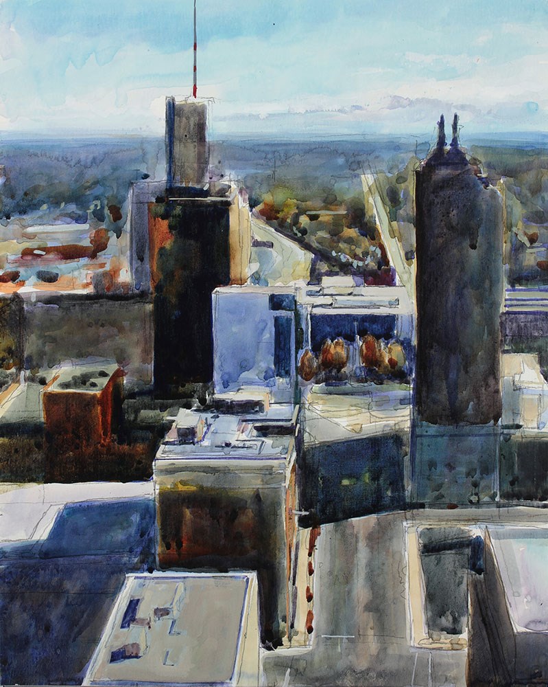 The observation deck at the top of Buffalo City Hall provides a great view of Court Street and a number of popular buildings, some of which I painted before. The Liberty Building is on the right and the Rand Building is the the one with the white and red antenna.