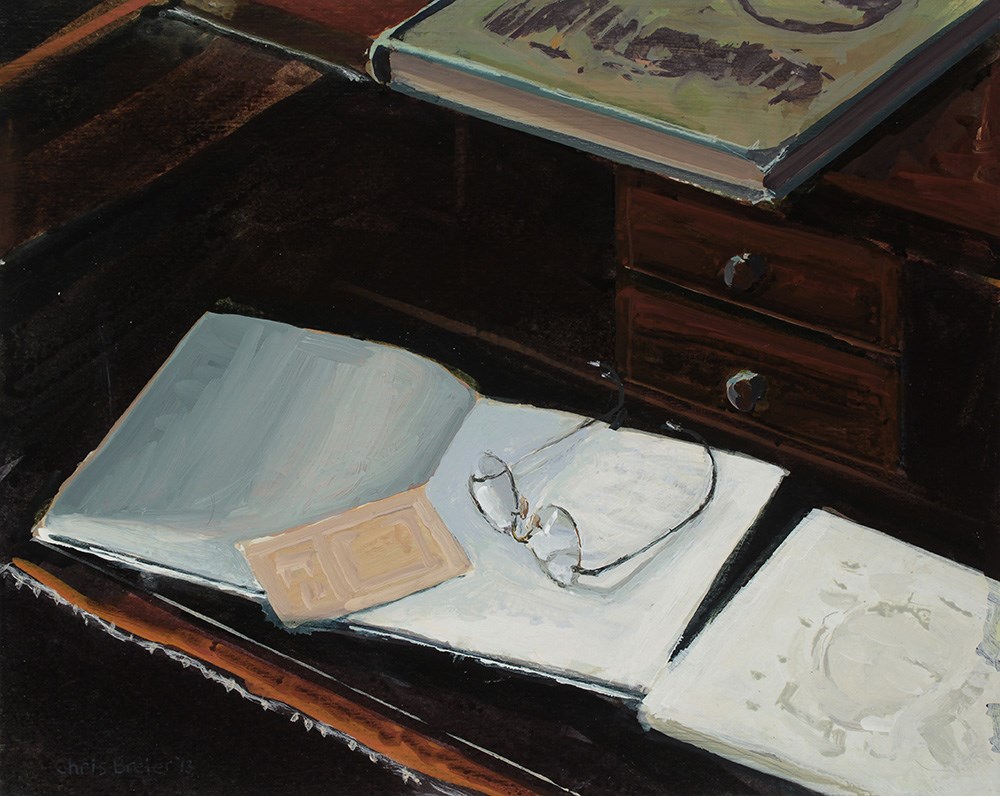 If I remember correctly, the green book on the top shelf is about orchids, and the book the eyeglasses are resting on contains handwritten notes. The one on the right is opened to a page with a technical illustration of some sort. I didn't render any of the text because it's too distracting-the eye has a tendency to jump right to it.