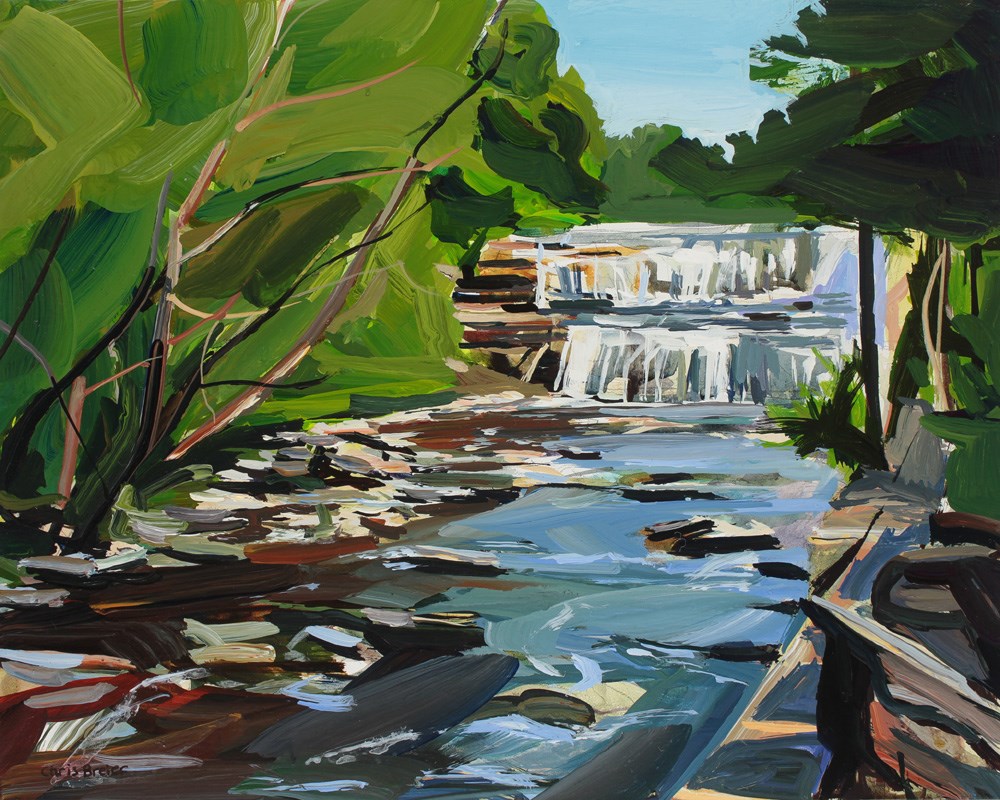 A common painting technique is to tone the white board with a color to eliminate the pure white, which makes it easier to judge the colors. For this painting, I used a wash of Quinacridone Nickel Azo Gold. Some of it shows through in the finished painting on the left side of the waterfall. The majority of the outdoor painting session was a struggle but that's how it often goes. If painting were easy, it would be boring! What's interesting is that I can't see any of the struggle in the finished painting, it looks like all of my other paintings. A few people stopped by to see what I was working on, one of them must have been a painter because he guessed that I was using acrylics. After a couple of hours, the sun disappeared behind the clouds and then it was a matter of time before it started to drizzle. |