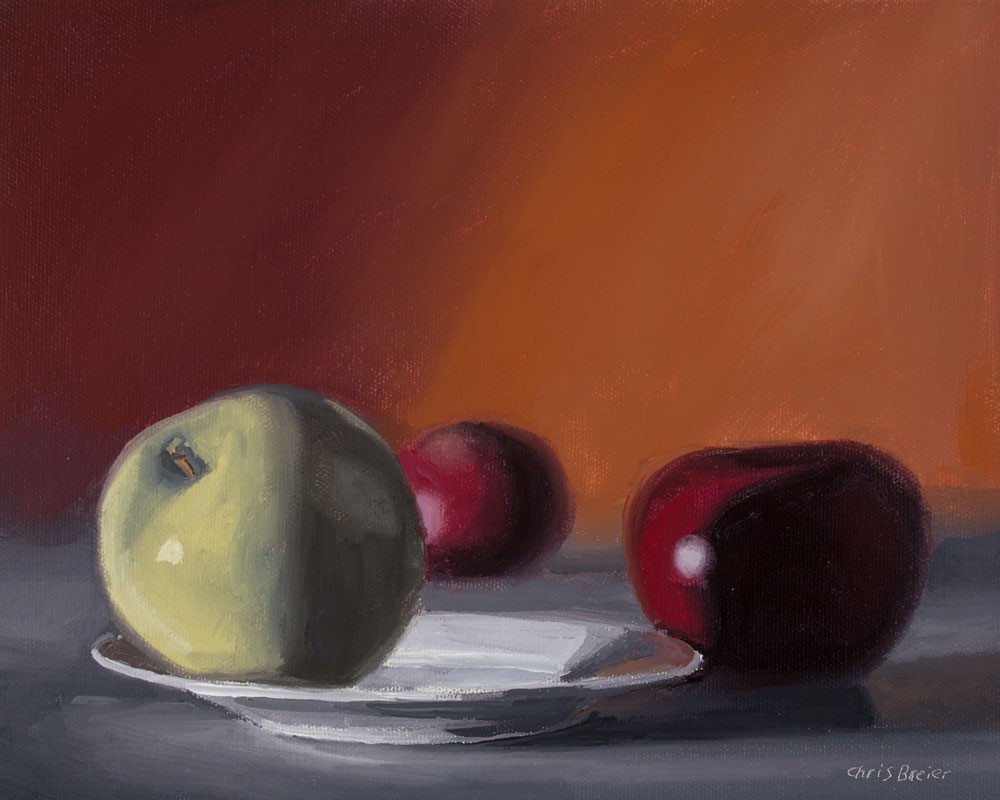 You can watch me paint this on YouTube. I like combining warm and cool colors in the same painting. The Granny Smith apple creates a nice contrast against the orane background and the dark red McIntosh apples. You can watch me paint this on YouTube. I like combining warm and cool colors in the same painting. The Granny Smith apple creates a nice contrast against the orane background and the dark red McIntosh apples. |