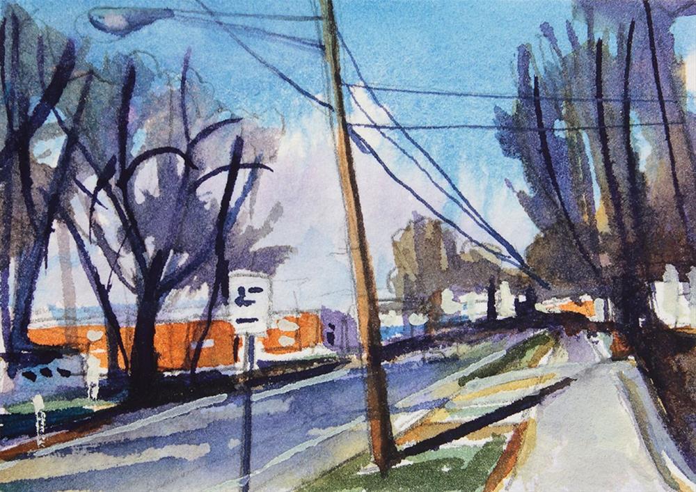 This painting also made me think about how it's tempting to remove power lines and signs from paintings, but sometimes they can be used to enliven a composition. Here they converge with the shadow of the phone pole to create an interesting zigzag. |