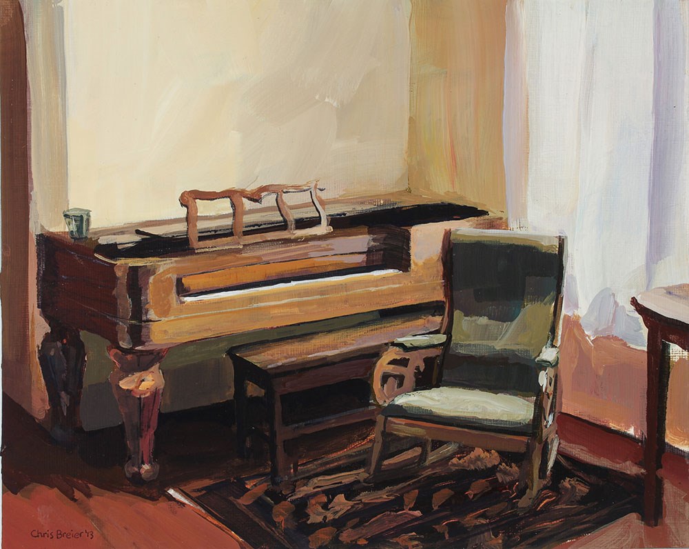 The curtain diffused the sunlight coming into the in the room and I enjoyed painting the soft lighting. I noticed that there are examples of reflected color in this painting, the color of the floor is reflected onto the piano legs and the lower part of the walls. The rug had an intricate pattern but I roughed in the basic shapes and kept it simple. If you know what kind of piano this is, feel free to leave it in the comments.
