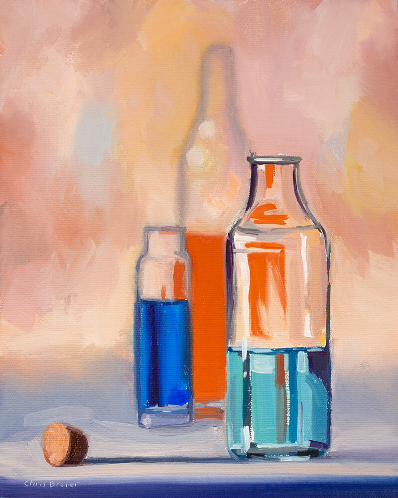 I used food coloring to create an interesting and colorful color scheme for this painting. I also invented the background colors. The bottles in the background have softer edges so that the bottle in the foreground stands out more. I used food coloring to create an interesting and colorful color scheme for this painting. I also invented the background colors. The bottles in the background have softer edges so that the bottle in the foreground stands out more. |