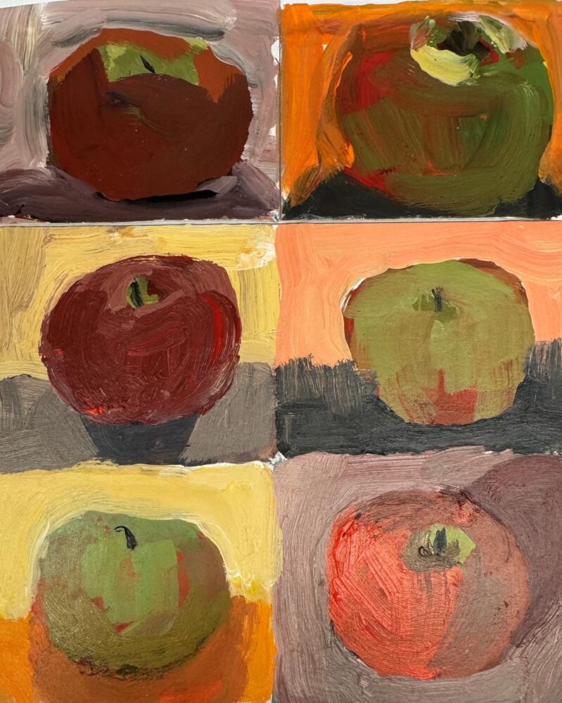 I did this for the 10 minute challenge and really enjoyed seeing all the variety from the same apple. I will do this often. It’s a great exercise. Each painting is 2.5x2 inches. Thank you, Carol. I did this for the 10 minute challenge and really enjoyed seeing all the variety from the same apple. I will do this often. It’s a great exercise. Each painting is 2.5x2 inches. Thank you, Carol. |