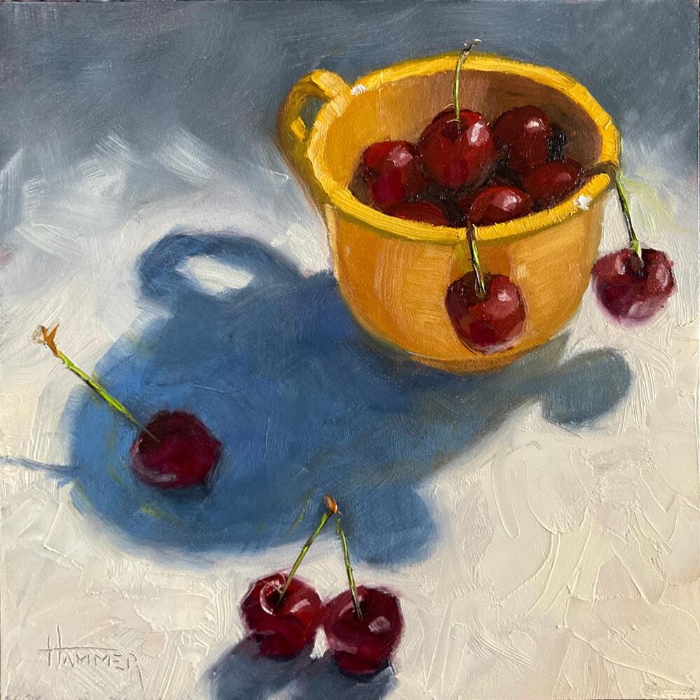 These two risk-taking cherries decided to leap out of the cup and hang on the edge. I think they are just showoffs. No one was hurt during the painting of these cherries.