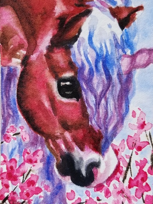 Half magical, half realism, a chestnut welsh pony unicorn trying to decide if Cherry blossoms make a good snack!