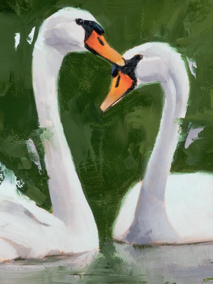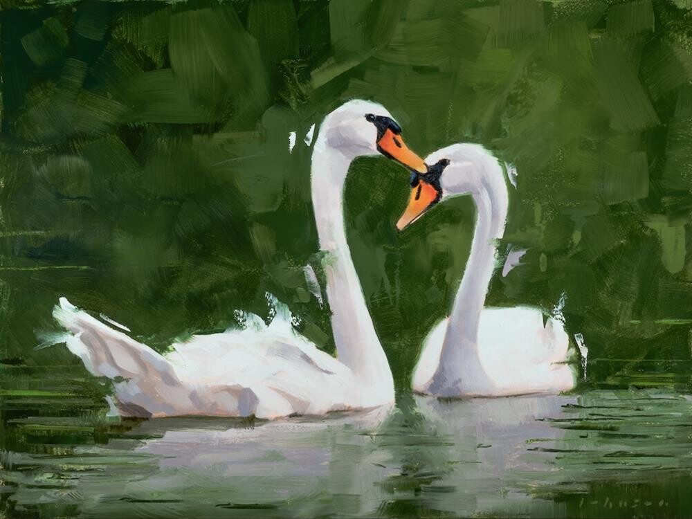 Two mute swans in the classic heart-shape courtship display, painted for an Instagram love birds challenge in January 2026. Painted in oils on a 9×12” Ampersand Gessobord panel. Two mute swans in the classic heart-shape courtship display, painted for an Instagram love birds challenge in January 2026. Painted in oils on a 9×12” Ampersand Gessobord panel. |
