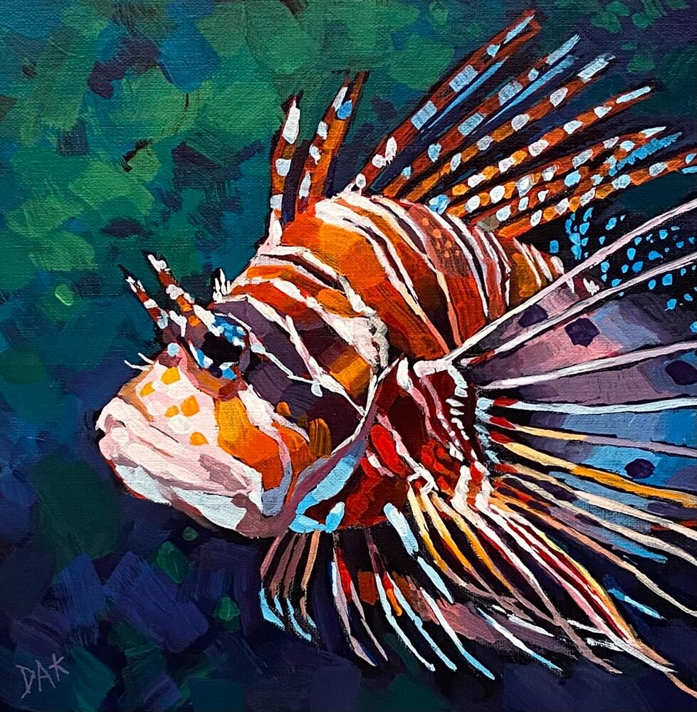 Lionfish are an extreme natural wonder, extreme in my opinion. It looks like an alien or it should be in a circus, I mean what a great outfit its adorned with. I think a costume like this has been done in sci-fi movies. But you don't want to get to close as it has a natural weapon with those spines. Anyway I needed some color and have been putting this project off for some time, (you can probably understand why) and this filled my desire for color. I use professional heavy body acrylics and Ampersand gessobord is an acid free museum series panel.