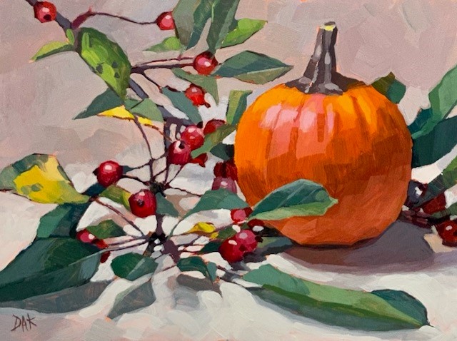 Fall is pumpkin time and I always paint a few pumpkins every year. I needed something to pull me back into painting again. This years bounty of tiny crabapples was plentiful, the branches on my tree are heavy with them, the blooms this spring were beautiful. I've wanted to paint the crabapples for a long time and pairing them with a pumpkin was a winning combo. Do the birds eat crabapples during the winter I wonder? It would be nice if they weren't wasted. If the branch survives maybe there will be another crabapple painting, the leaves are going fast.