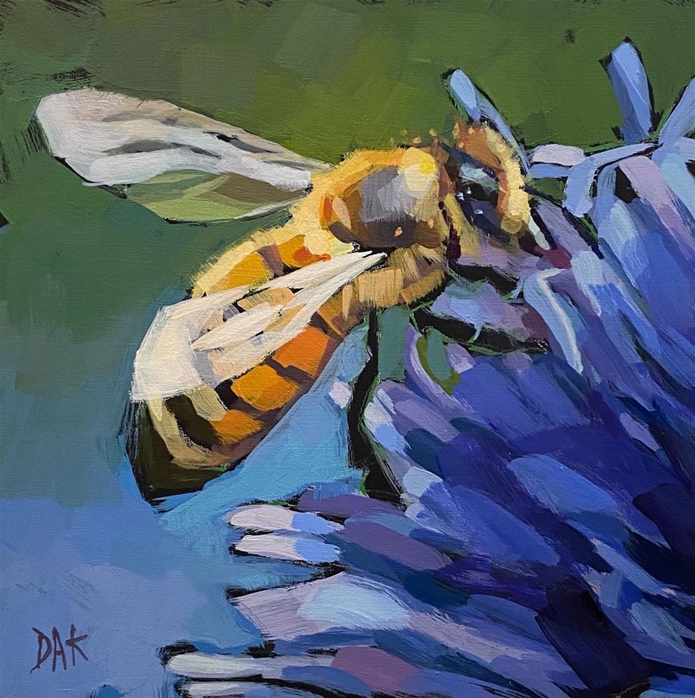 It's not always easy coming up with a title for paintings. But I'm particularly fond of this title since bees always look like they are doing a little dance on top the flower to get at the pollen. The little busy dancers covered in speckles of pollen are one of summers pleasures. When I see a bee I feel like all things are right in the world. Size has nothing to do with importance.