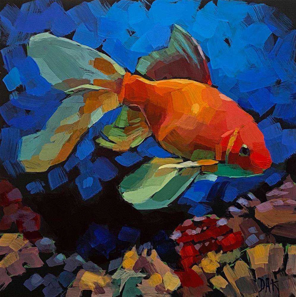 I love bright colors so painting goldfish in a dark blue environment is a lot of fun. This subject matter was made for painting on a black gesso ground. The original photo had a black background so I played around with some different ideas for the underwater garden.