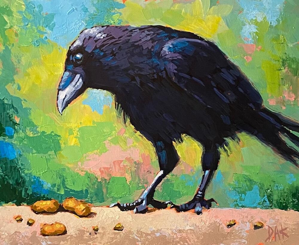 Crow painting #3. Using a palette knife is new for me, the process and textures are amazing. Also it was a lot of fun experimenting with the background colors on this piece, just doing whatever in the moment. Even though crows seem to be basically black there is much more color in their feathers than you think.