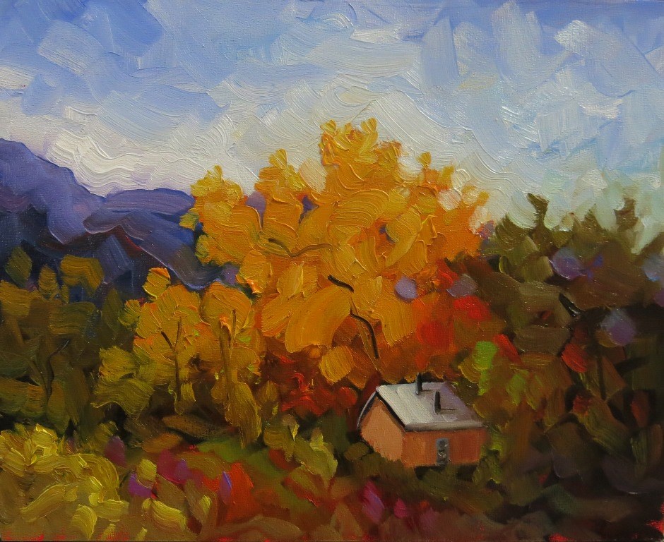 a quaint little adobe under the trees against the backdrop of the Sandia mountains