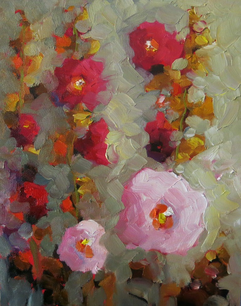 colorful varieties of pink hollyhocks against an adobe grey wall