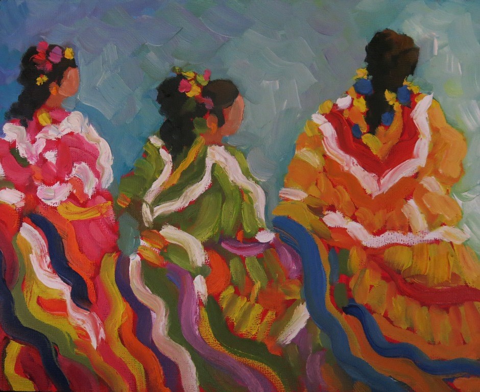 a trio of colorful bailla folklorico dancers waiting to perform