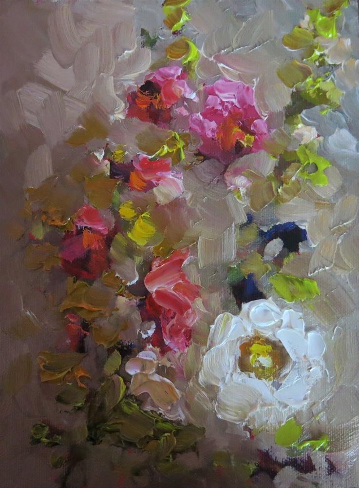 beautiful, dreamy, impressionistic hollyhocks on a grey adobe wall